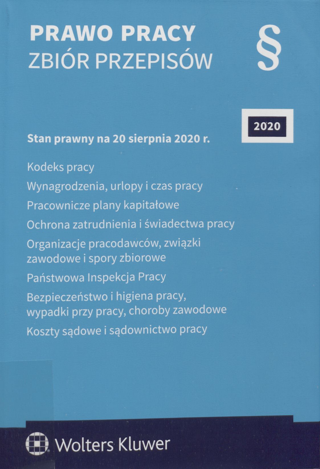 Prawo pracy : zbiór przepisów 2020. - 32. wydanie, stan prawny na 20 sierpnia 2020 r., uwzględnia zmiany wchodzące w życie 20.02.2021 r. - Warszawa : Wolters Kluwer, 2020. - 1019, [5] stron ; 21 cm.