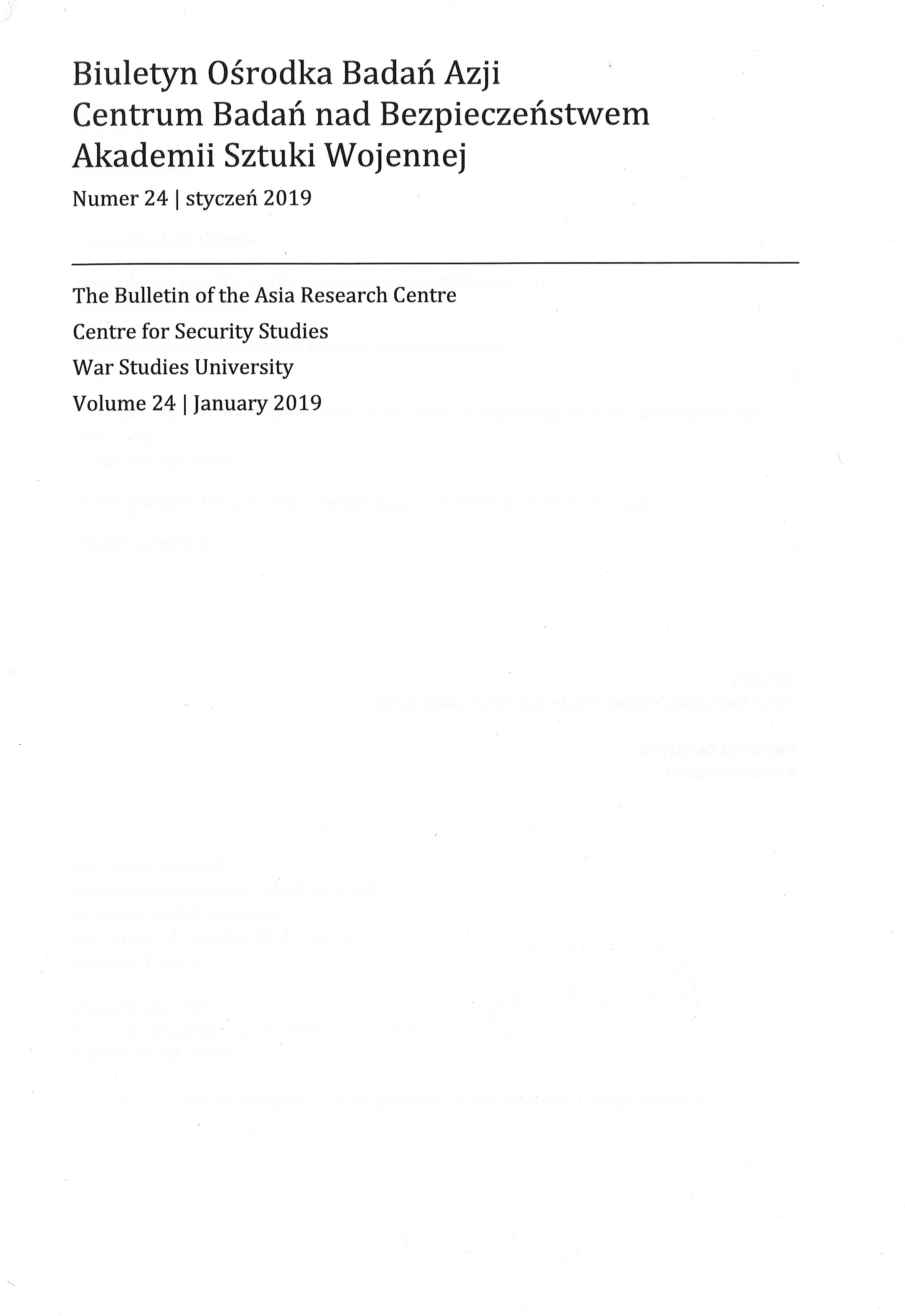 Od 2017, nr 13 tytuł okładkowy: Biuletyn / Akademia Sztuki Wojennej. Centrum Badań nad Bezpieczeństwem. Ośrodek Badań Azji.